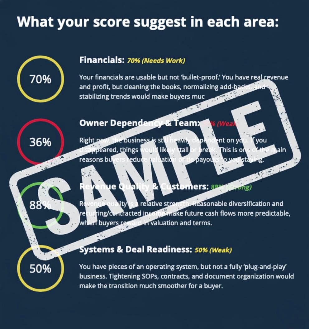 Answer 16 quick questions and get your Exit Readiness Score, buyer red‑flag count, key‑person risk, and 18–36 Month Exit Checklist in one report.